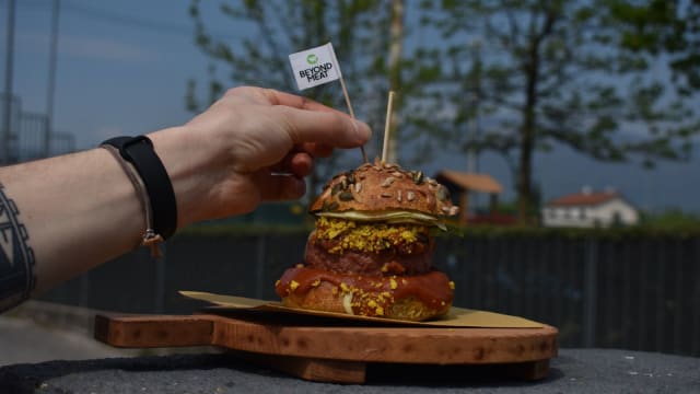 - Bun vegano artigianale al sesamo, burger vegetale al sapore di carne, pomodorini confit, senape in agrodolce, peperoni rossi e gialli in agrodolce e valeriana.
