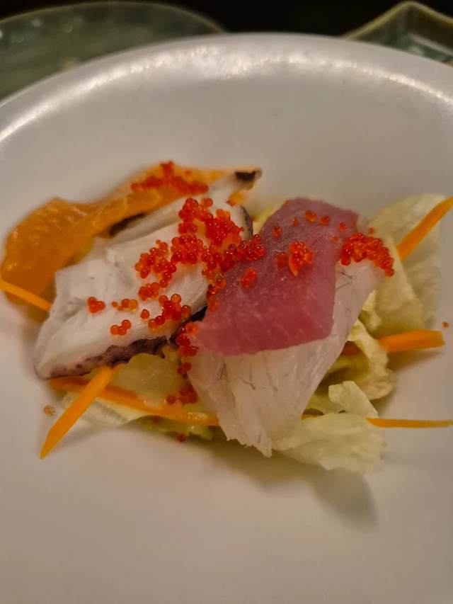 - Tonno a dadini con salsa soia agli aglumi e olio olive extra,coperto mango avocado mandorle,gamberi fritto.