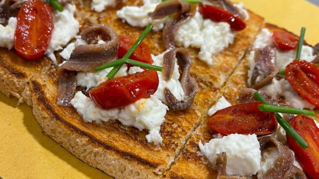 Impasto classico, prosciutto crudo di parma, carciofini, spuma di ricotta romana DOP e pesto di rucola