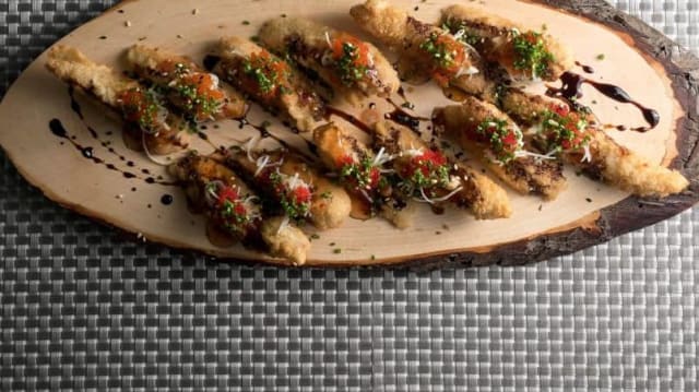 Ceviche, tobikko, alface enrolado em papel de arroz c/ ponzu