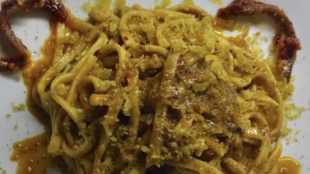 Un piatto tipico e rustico che combina alici fresche, mollica di pane e pepe dolce condito con formaggio, aglio, prezzemolo, olio, con filetti di alici fritte ed emulsione al pecorino