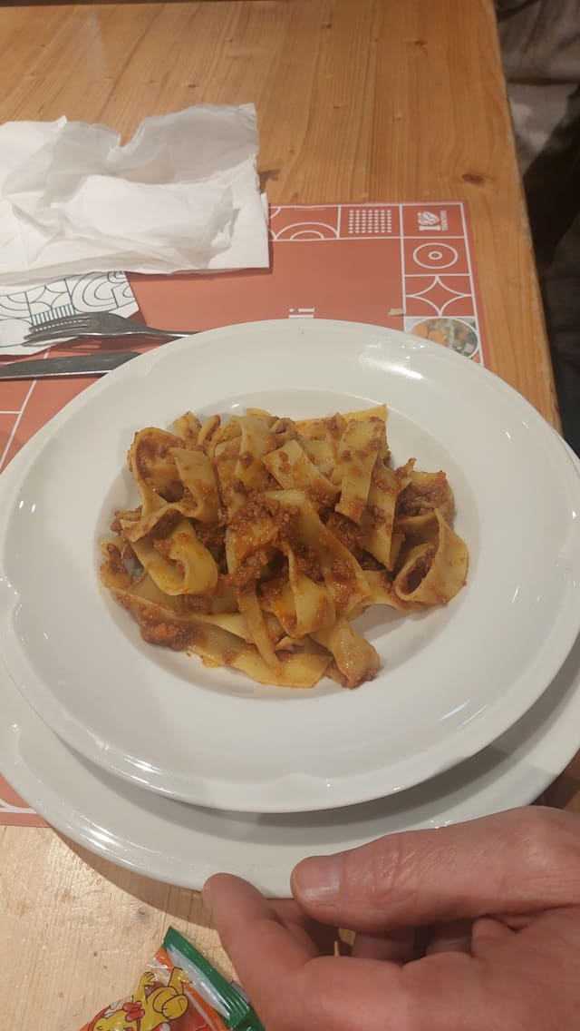 Pasta all’uovo, sugo di lepre (lepre, lardo, sedano, carote, cipolla, vino, EVO, pepe, pomodoro)