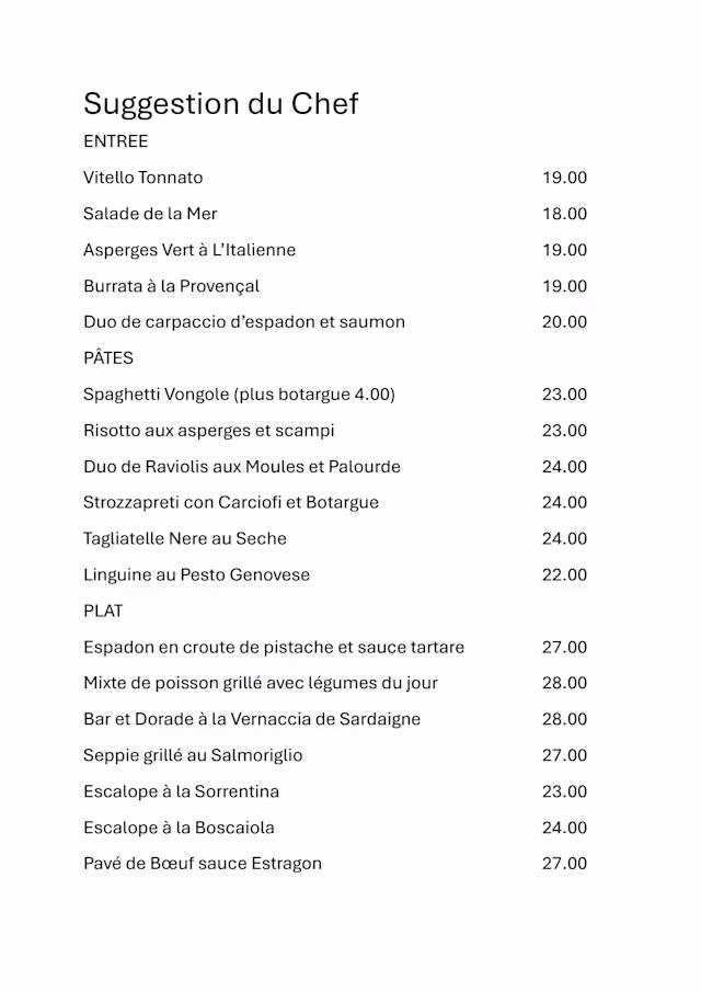 We have been coming here for years and will continue to do so. The reasons: friendly staff, good food and wine.. At lunchtime a two-course fixed menu is available for € 25, dessert is optional but very tempting!