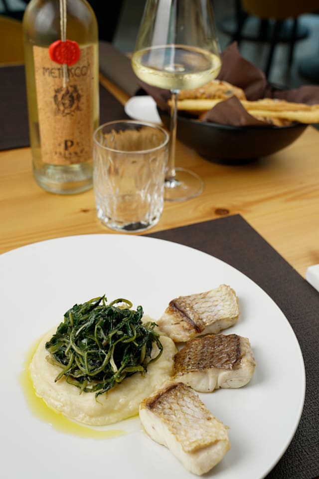 Filetto di pesce fresco del giorno con crema di fave bianche, cicoria selvatica e olio al peperoncino