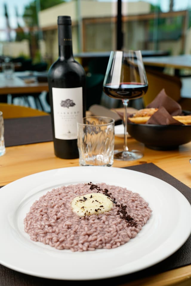 Riso carnaroli riserva san massimo al primitivo di manduria con fonduta di pecorino e polvere di olive leccine