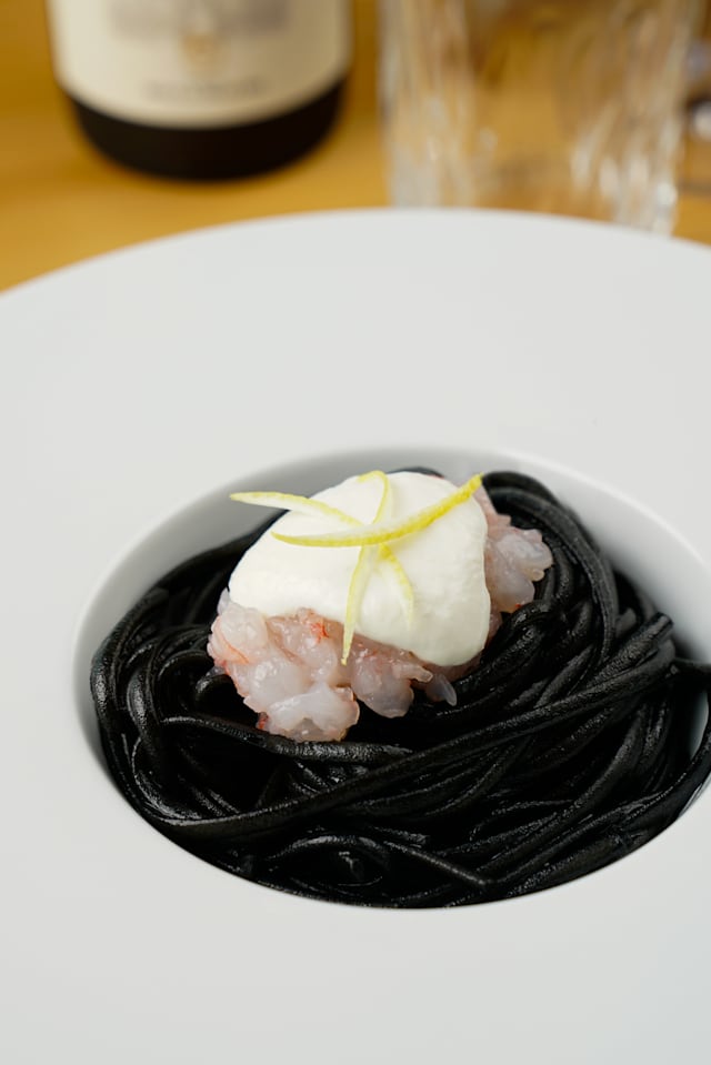 Linguine al nero di seppia con battuto di gambero viola di gallipoli e crema di burrata aromatizzata al limone