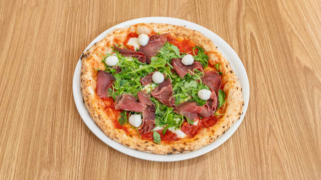 - Sauce tomate, tomates demi-séchées, bresaola della valtellina I.G.P., mozzarella di bufala campana D.O.P., roquette, parmigiano reggiano D.O.P.