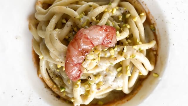 Chitarrina cacio e pepe con gambero rosso e la sua bisque