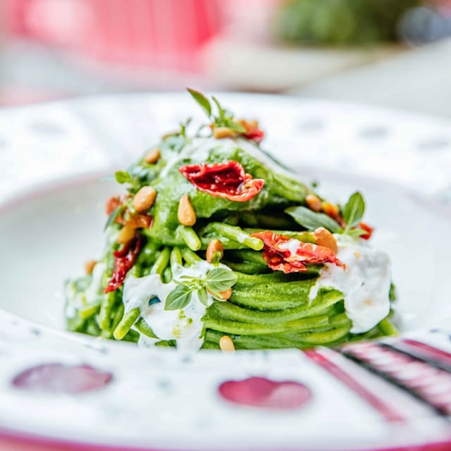 Crème de pesto, mozzarella fior di latte, tomates datterini confites, stracciatella et pignons grillés