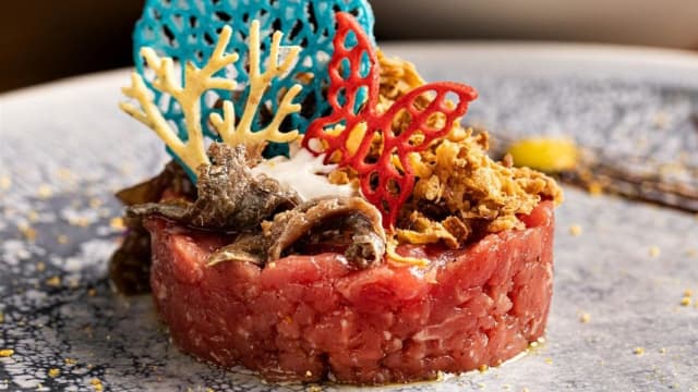 - Tartare di manzo battuta a coltello con Philadelphia, cipolla caramellata, cipolla crispy e alici.