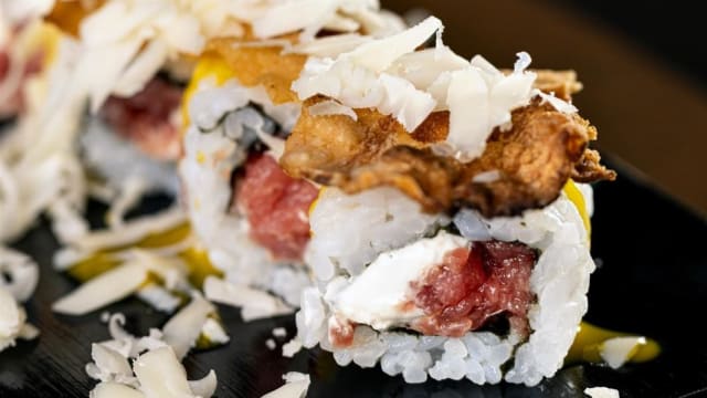 - Riso, tartare di manzo, Philadelphia, salsa barbecue, cipolla croccante