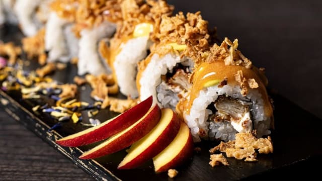 - Riso, tartare di manzo, Philadelphia, mango fresco, coulise di mango