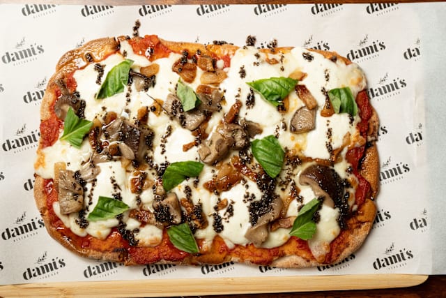 Base de tomate, mozzarella, mascarpone, guanciale, setas de temporada, tartufata y hojas de albahaca.