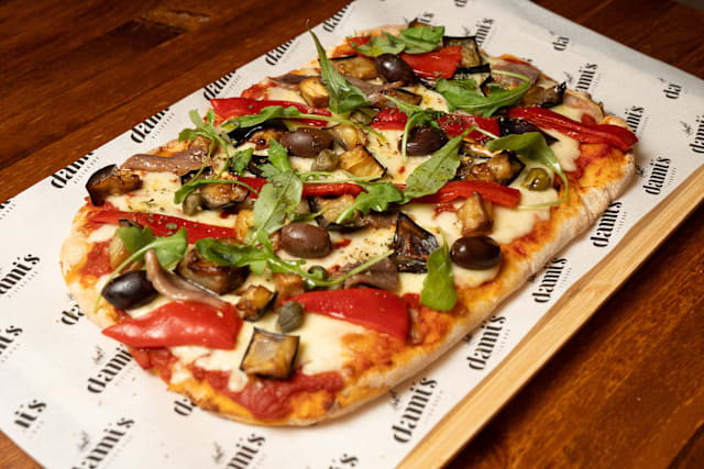 Base de salsa de tomate pomodoro casero, mozzarela fior di late, berenjenas asadas,pimientos de piquillo, setas de temporada alcaparras, olivas kalamata y filetes de anchoa