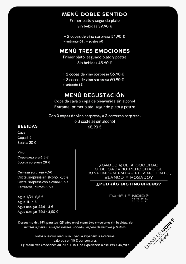 Thank you so much Camilo for your good review, We are glad to know that you enjoyed the surprise menu and the experience in the dark. As you said, tasting a surprise menu without seeing it is a different way to enjoy the food. In the dark this is easy to confond meat and fish or the colors of the surprise wines. However, we always work with pasion in order to offer only good surprises ! Thanks a lot from the kitchen team, your waiter and all the staff from Dans le Noir ? Madrid.