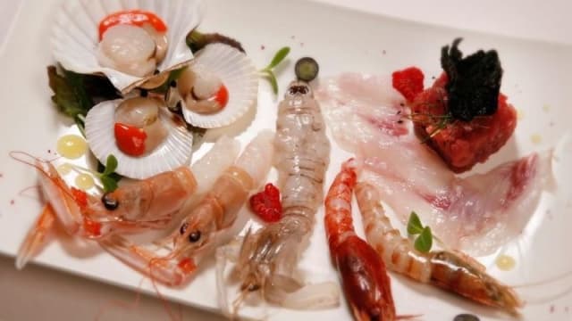 Gambero rosso, scampi, mazzancolla, canocchia, capasanta, canestrelli, tartare di tonno rosso del Mediterraneo, carpaccio di branzino, ostrica