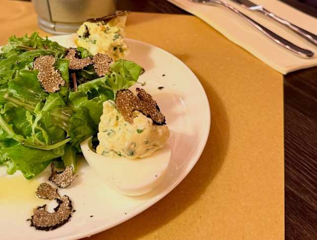 - Le tartare de veau, truffe, artichauts violets, grana, frites maison et salade...