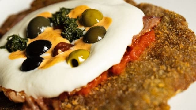 Milanesa de ternera con espuma de provolone, olivas y tomates (para compartir)