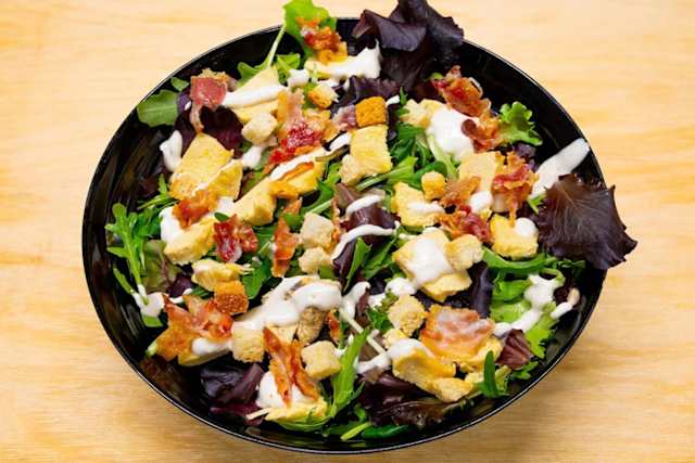 - Petto di pollo, pancetta croccante, salsa caesar, crostini di pane, insalata mista