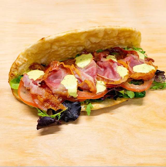 - Pancetta croccante, pomodoro, maionese al coriandolo, insalata