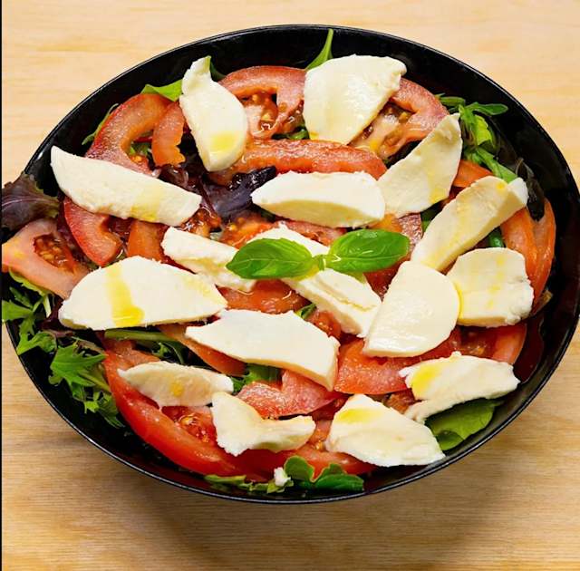 - Pomodoro a fette, mozzarella fior di latte, basilico, olio evo, insalata