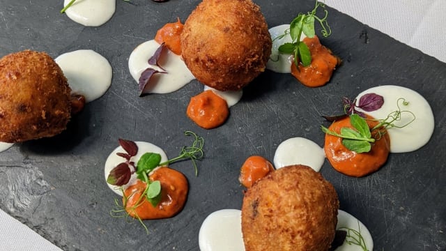 Arancini siciliani al ragù su emulsione al formaggio e zafferano