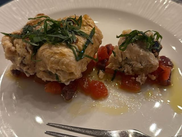 Fetta di pesce spada, pomodoro, iceberg, olive, capperi e salmoriglio
