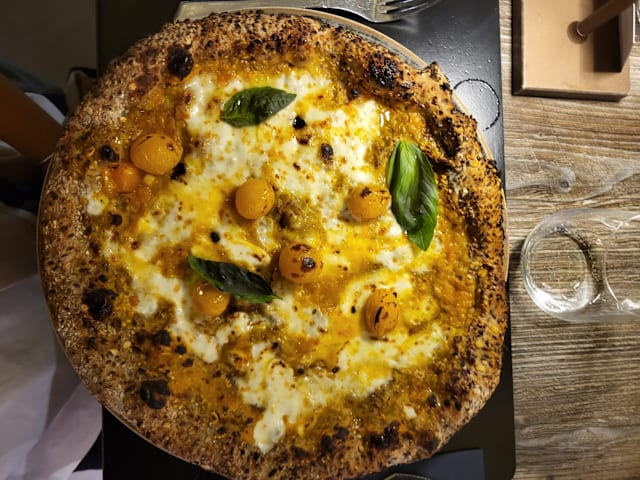 Salsa di datterino giallo, in uscita burratina di murgia, cipolla caramellata, tonno callipo, mentuccia fresca, tagliata a spicchi