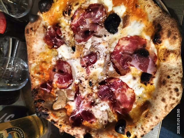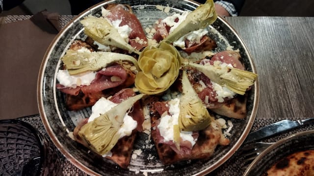 Pizza bianca: in uscita crudo di parma 24 mesi, burratina di murgia, carciofo romano con gambo, scaglie di grana padano, mandorle tostate, olio EVO agli agrumi