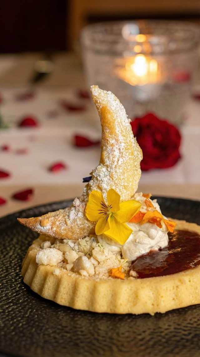 - Ravioli de estofado al Barolo, crema de alcachofa, granella de pistacho y láminas de Manchego.