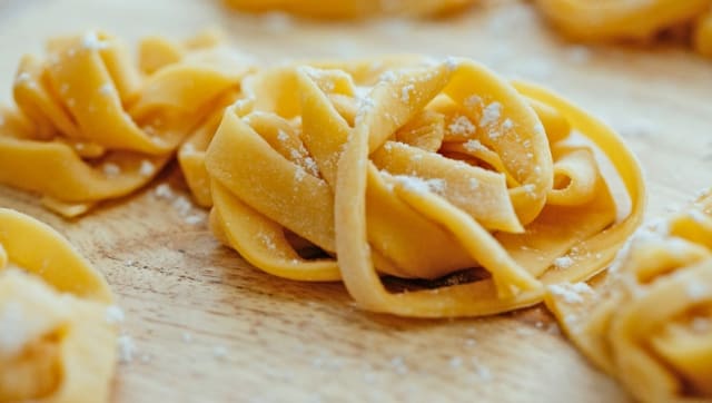 Tagliatelle al gorgonzola, parmigiano e noci servite nella ruota di parmigiano