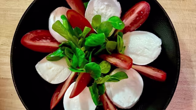 - Une généreuse salade caprese avec mozzarella di bufala (250 g), tomates gorgées de soleil et basilic parfumé, un classique méditerranéen dans sa plus belle expression