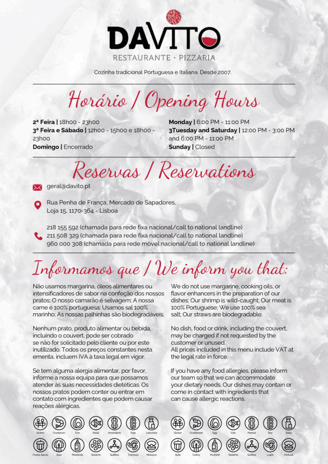 ItalianMediterraneanPizzeriaPortugueseTraditional cuisineVegetarianEuropeanPizzaGood for a business lunchRomanticTraditionalCheap eatsGluten freeLactose intoleranceVegan dishesChildren's menuDog-FriendlyFootball gamesWheelchair AccessibleWifi