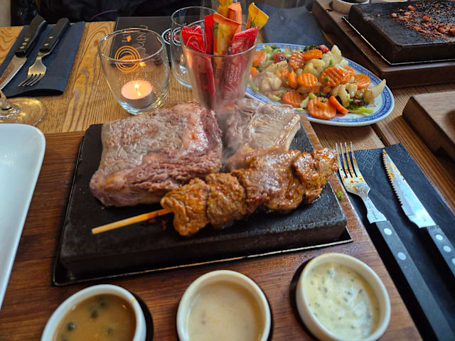8/10Food was good but would have preferred our meat (Chateaubriand) to be fully cooked when brought to table instead of outer sealed and left to customer to finish the meat of hot stones - I thought this was the chef's job!! Staff not very attentive - need to limit use of personal phones!!