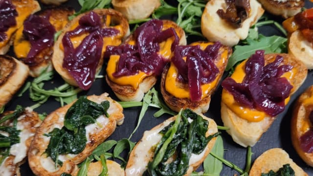 Tris di snack di benvenuto, tagliere di salumi, formaggi, verdure grigliate, bruschette, arrosticino, sfoziosità ed il tutto accompagnato da pane. Fritto misto di anello di cipolla, oliva ascolana, aletta di pollo, nugghet, patate fritte, salse e drink analcolico o alcolico a scelta.