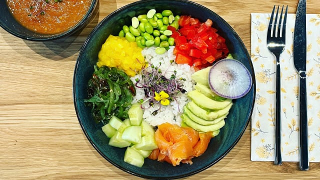Pain artisanal, écrasée d'avocat, graines de courge, graines de chia, baies de goji, sésame prune, chips de légumes, fleurs