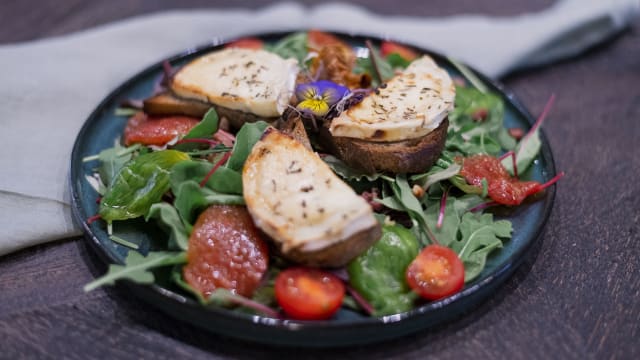Pain artisanal, asperges vertes, oignons caramélisés, fromage frais aux herbes, grana padano, sumac, chips de légumes, fleurs comestibles