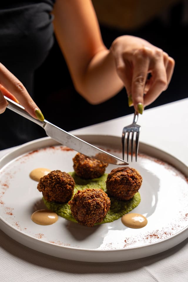 Polpette di scottona su crema di piselli & maionese alla paprika dolce