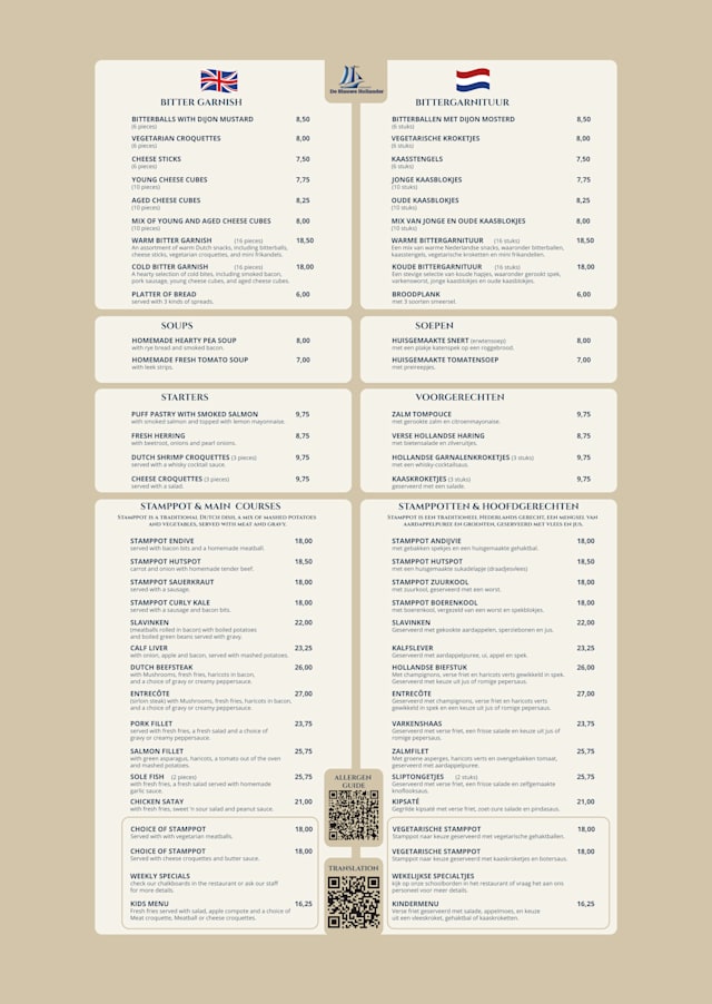 7.5/10Visiting Amsterdam, my group and I wanted a Dutch dinner before our trip ended. One in the party arrived first and was able to sit down, but they weren’t offered water for 20 minutes. No waiter stopped by. Soon, the other two in the party arrived and we had to get the attention of another waiter after another 10 minutes to order. Between the three of us, two ordered from menu 1 (which has the Stamppot — which was highly recommended) and one of us ordered from menu 2. A little bit unbeknownst to us, the waiter brought out three menu 1 items (so, three Stamppots — and one of them was the wrong one). The food was great but we didn’t want to make another fuss about it. So overall the food was great but the service was questionable. It’s possible we caught the restaurant or waiters on a non-ideal day