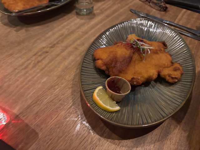 - Schnitzel van varkersvlees met gebakken champignons, uien en spekjes