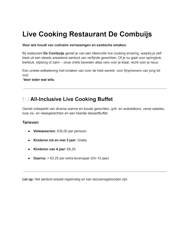 Geniet onbeperkt van diverse warme en koude gerechten, grill- en wokstations, verse salades, luxe vis- en vleesgerechten en een heerlijk dessertbuffet. Het aanbod wisselt regelmatig en kan seizoensgebonden zijn