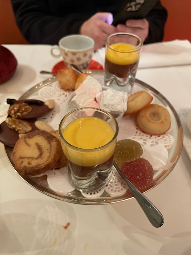 9/10We loved the food and also liked the wine, although our glasses sat empty from time to time. We liked our table on the mezzanine very much, with views over the whole restaurant and also the illuminated Belfort through the window. Service was charming but perhaps too busy to be fully attentive to us and we had to ask for the bill three times at the end of the night, which was a bit wearisome.