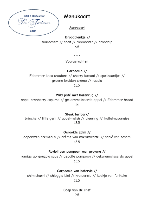 Wonderful flavors at De Forunta This charming restaurant is located in the lovely city Edam near Amterdam. The chef serves delicious dishes traditionally prepared with the best products. The friendly staff will make you feel comfortable right away! They serve you the best wine for a perfect...