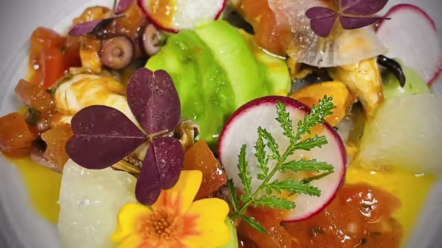 - Salade met pata negra, krokante gamba’s, gepocheerd ei en kalfs bitterbal met een dressing van parmezaan