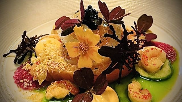 - Krokante papadum met geroosterde tonijn, rivierkreeft, wakamé, yuzu, komkommer en wasabi mayonaise