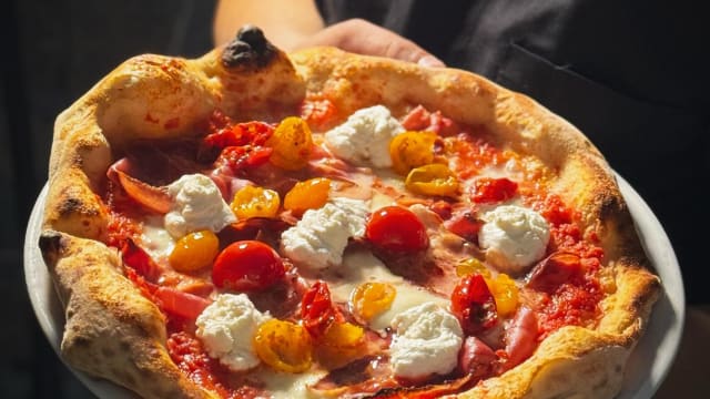 (Rucola, hamburger, anellini di cipolla, pomodori secchi, burrata)