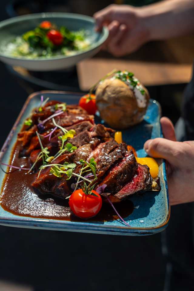 - (2 personen) Chimichurri – sjalot crème – seizoen groenten – gepofte aardappel – chilivlokken – pancetta – crème fraîche