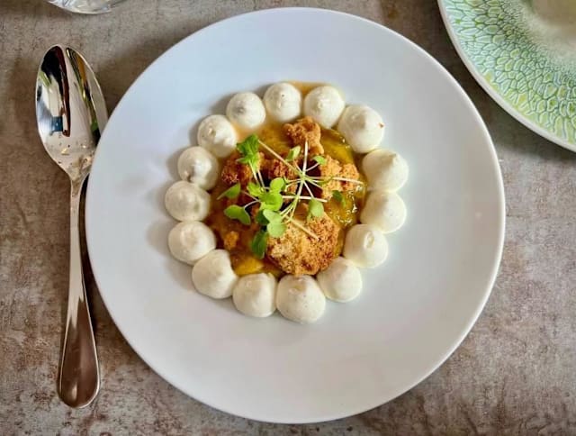 Patate douce fondante, crème paprika, salade d'herbes et oignons frits