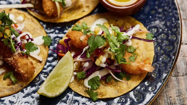 Marinated plant-based minced beef, pico de gallo and salsa blanca