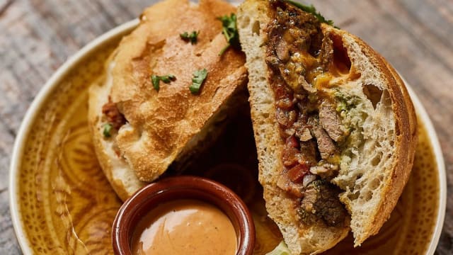 Mexican grilled bun topped with beanspread, pico de gallo, melted cheese, salsa verde, crème fraîche, tequila mayonnaise and cilantro